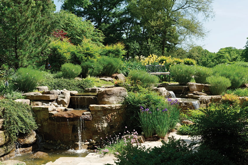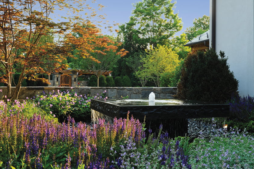 2/ AU NATUREL Starting with a barren slope in a Great Falls backyard, Anthony Cusat of McHale Landscape Design created a true-to-life stream cascading over a bed of rocks. Bursts of iris, amsonia and pachysandra not only hide construction elements, but also add color and texture. Understanding the hydrology of a real stream, says Cusat, is crucial to creating a credible substitute. “Ensuring that storm water is managed and using stones and plants that are in scale is also essential,” he explains. “By buffering unwanted noise, adding to the ambience of a natural setting and providing an element for human and wildlife interaction, a water feature can be truly dynamic throughout the entire year.”