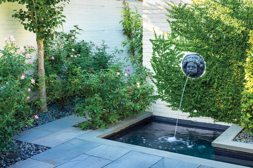 11/ HOW DO YOU INTEGRATE A WATER FEATURE INTO A SMALL SPACE? This project fused a 21st-century garden with a renovated 19th-century Georgetown home. We transformed the garage into an integral element of the garden and found a perfect spot on one of its walls to install a cherubic marble angel fountain found by the client in Italy. This element broadened the feeling of space in this city garden. Water flows into a tinted-concrete basin framed by bluestone coping. —Katia Goffin, Katia Goffin Gardens