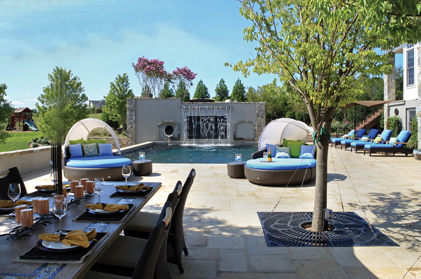 7/ PARTY AL FRESCO A dramatic focal wall was an important element of Ed Ball Landscape Architecture’s design for an outdoor entertainment space in Aldie, Virginia. Guests in and around the pool can watch TV and movies thanks to a special film installed inside a large, double-pane pool-house window. To create another point of interest, Ball says, “We installed a sheer-descent waterfall that cascades over a flagstone ledge planted with Virginia creeper. This softened the edges of the walls, stucco and stone.” Ball recommends top-notch filtration and cleaning systems for water features. “Make sure you’re spending money on the quality of the materials being used.”