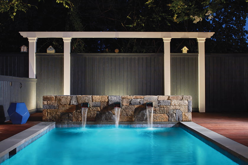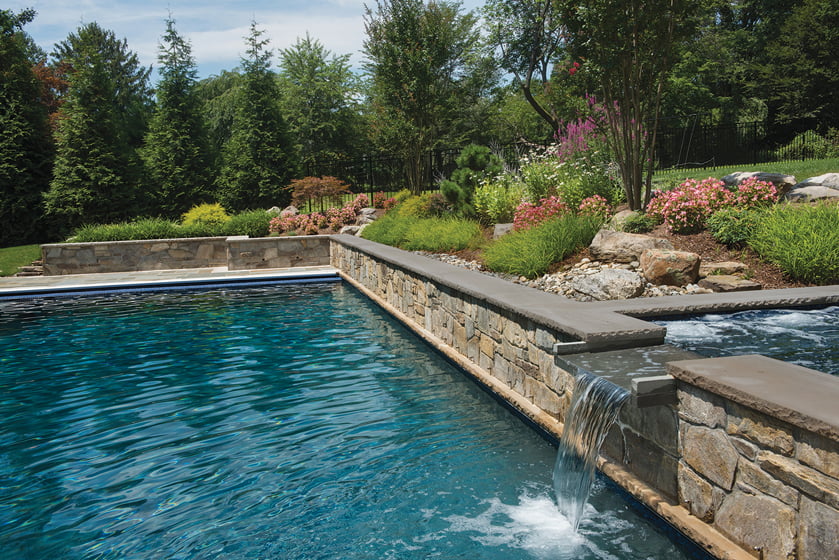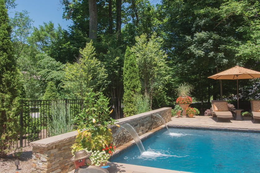 10/ WHAT FACTORS INFLUENCE THE SOUND OF FLOWING WATER? Wall height and flow rate need to be taken into account to create the sound you are looking for. You also want the water feature to be in proportion to the pool and/or property to ensure that it isn’t over- or underwhelming. For this Edgewater, Maryland, project, the clients wanted to hear the soothing sound of flowing water, as well as to buffer the noise of the community traffic. —Jeff Crandell, Scapes, Inc.