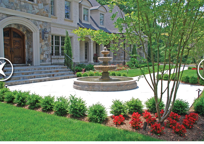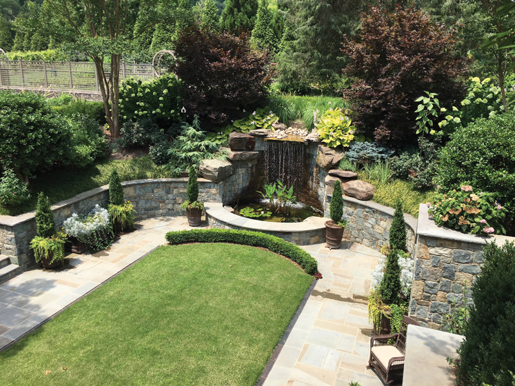 8/ WHAT TECHNICALITIES ARE OFTEN OVERLOOKED? Water features, like this fountain in Leesburg, need to be designed and maintained properly to prevent them from becoming eyesores. Things like head pressure, distance, friction loss, etc., are important factors to consider. Algae control is often overlooked. Even moving water will start to develop forms of algae if proper controls are not designed into the system. —Josh Kane, Kane Landscapes, Inc.
