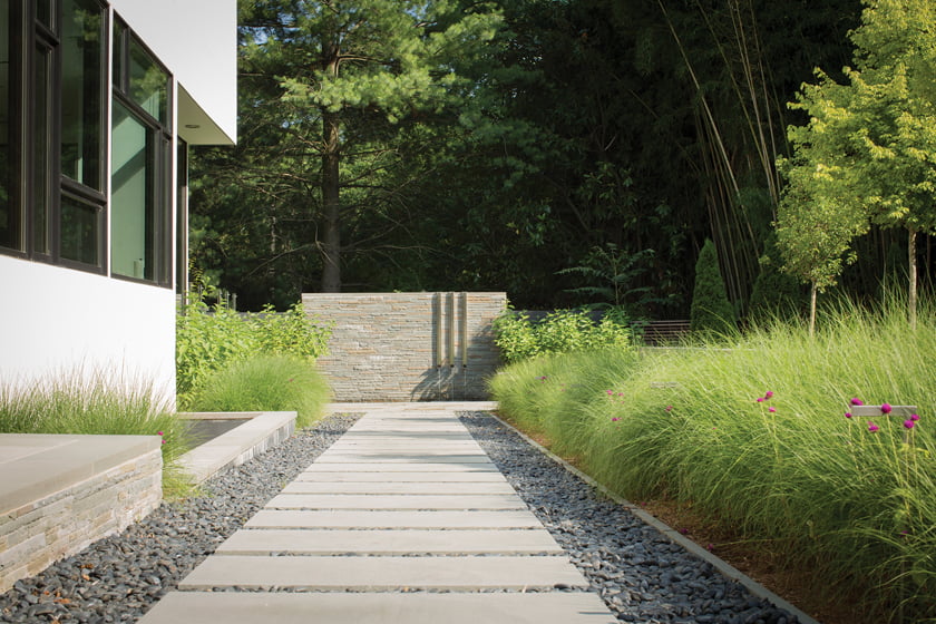 4/ CLEAN GEOMETRY Kevin Campion and Meredith Beach of Campion Hruby Landscape Architects conceived a garden to complement their clients’ Bethesda home, designed by architect Robert Gurney. Stainless-steel fountains on a stacked-bluestone wall draw visitors along the path in front of the house. To prevent water from splashing out of the pool below, they installed underwater cylinders to “absorb” flow as it hits the surface. “A water feature needs to function like a good, reliable car,” says Campion. “It should not leak or look messy.” When executed properly, he adds, a water feature energizes a finished landscape. “Like no other element of a garden, water captivates, heals and refocuses.”