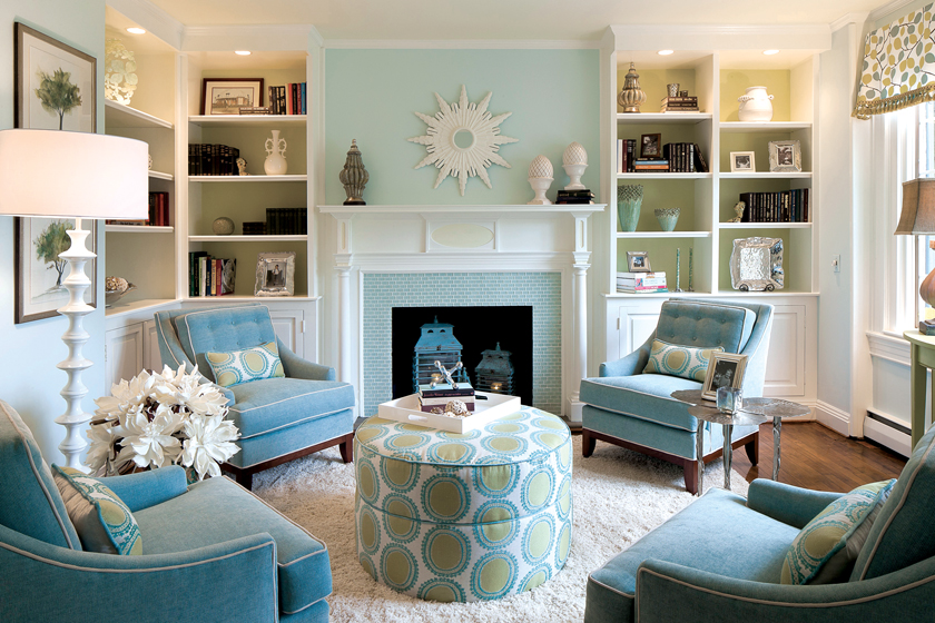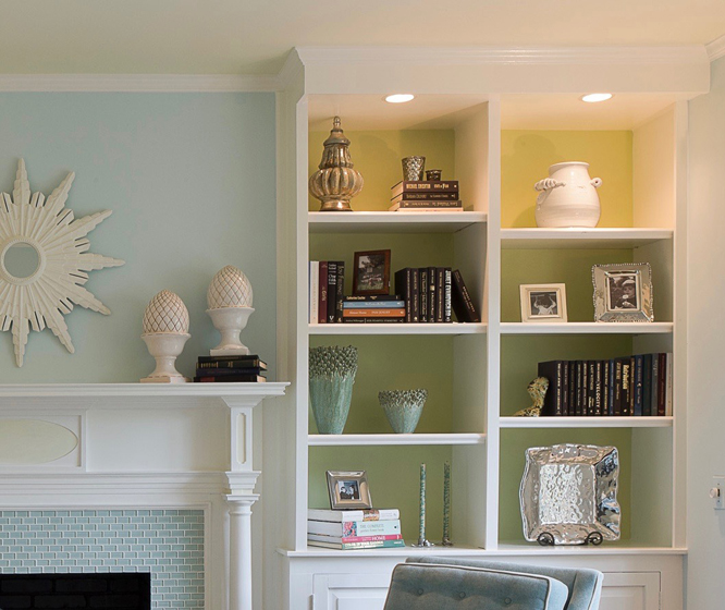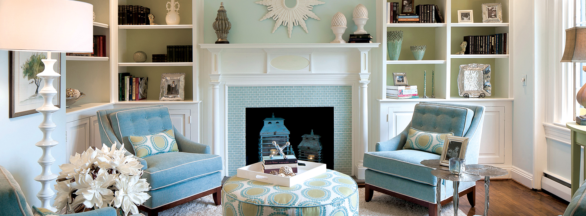 As part of a recent project, Liz Dickson brought a dated study to life by reconfiguring its built-ins, updating the fireplace with glass tile and incorporating furniture upholstered in modern fabrics.This makeover is just one example of how she creates comfortable, cohesive interiors that capture her clients’ sense of style.